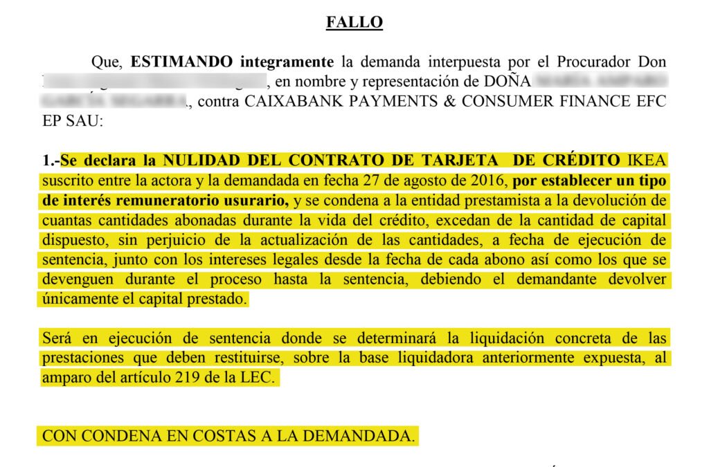Doña Mª de las Nieves Gómez Martínez, Magistrado-Juez titular del Juzgado de Primera Instancia número 12 de Madrid declaró la nulidad radical, absoluta y originaria del contrato de la tarjeta de crédito IKEA suscrito entre Dña. M.A.G.S. y CAIXABANK PAYMENTS & CONSUMER FINANCE EFC EP SAU en 2016 por establecer un tipo de interés remuneratorio usurario, condenando a CAIXABANK a la devolución de cuantas cantidades abonadas durante la vida del crédito excedieron de la cantidad del capital dispuesto, junto con los intereses legales desde la fecha de cada abono así como los que se devengaron durante el proceso hasta la sentencia, debiendo el demandante devolver únicamente el capital prestado. Además, se condena a CAIXABANK PAYMENTS & CONSUMER FINANCE EFC EP SAU al pago de las costas del juicio, al entenderse que existió actuación de mala fe por parte de CAIXABANK al no allanarse al reintegrar las cuantías. A la vista de su negativa, Dña. M.A.G.S. no tuvo más remedio que acudir a la vía judicial para satisfacer sus derechos íntegramente, siendo la demandante una persona física y minorista, sin conocimiento y experiencia del mundo financiero.